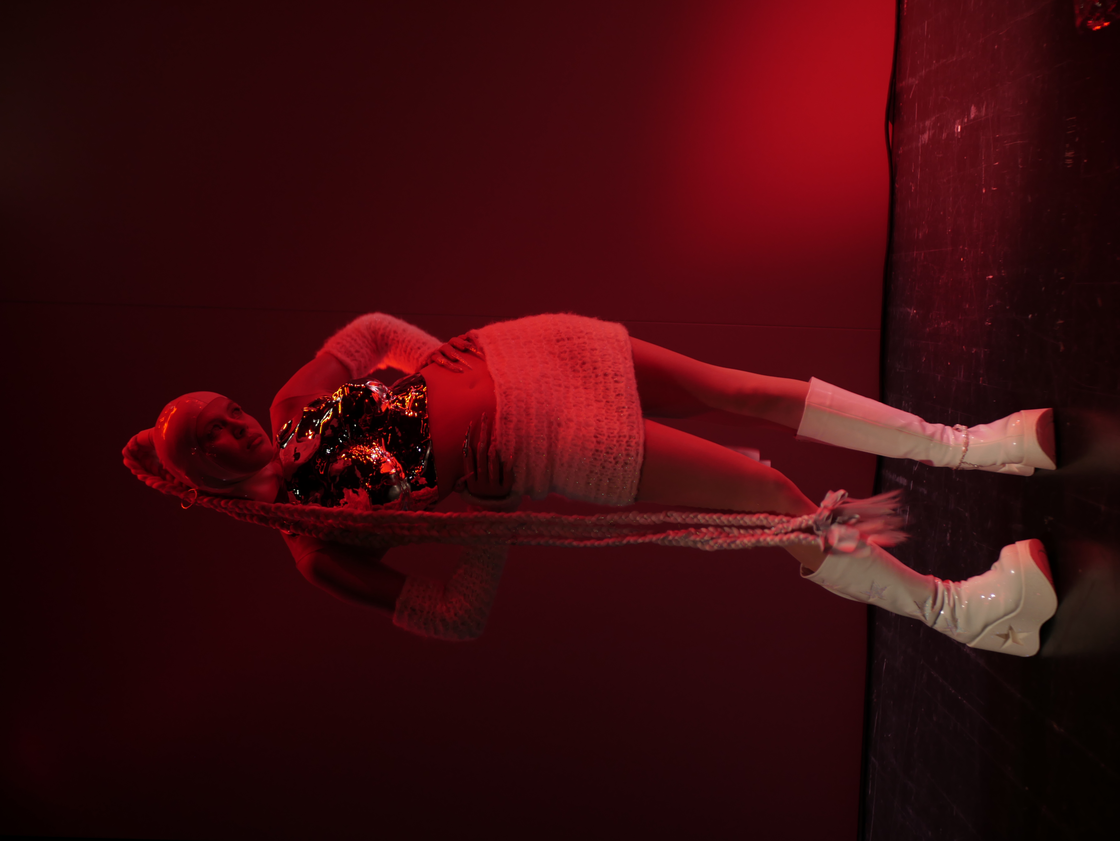A live ASMR performance on the inner critical voice and queer mental health. Hand-knitted pieces show how a person felt while knitting: In a relaxed state, the stitches are loose and soft. Being physically tense creates a tight, rigid pattern. When we are daydreaming, small bumps or holes show. A knitted piece thus works like a diary of mental health. Textile, body and installation merge into one sculpture.