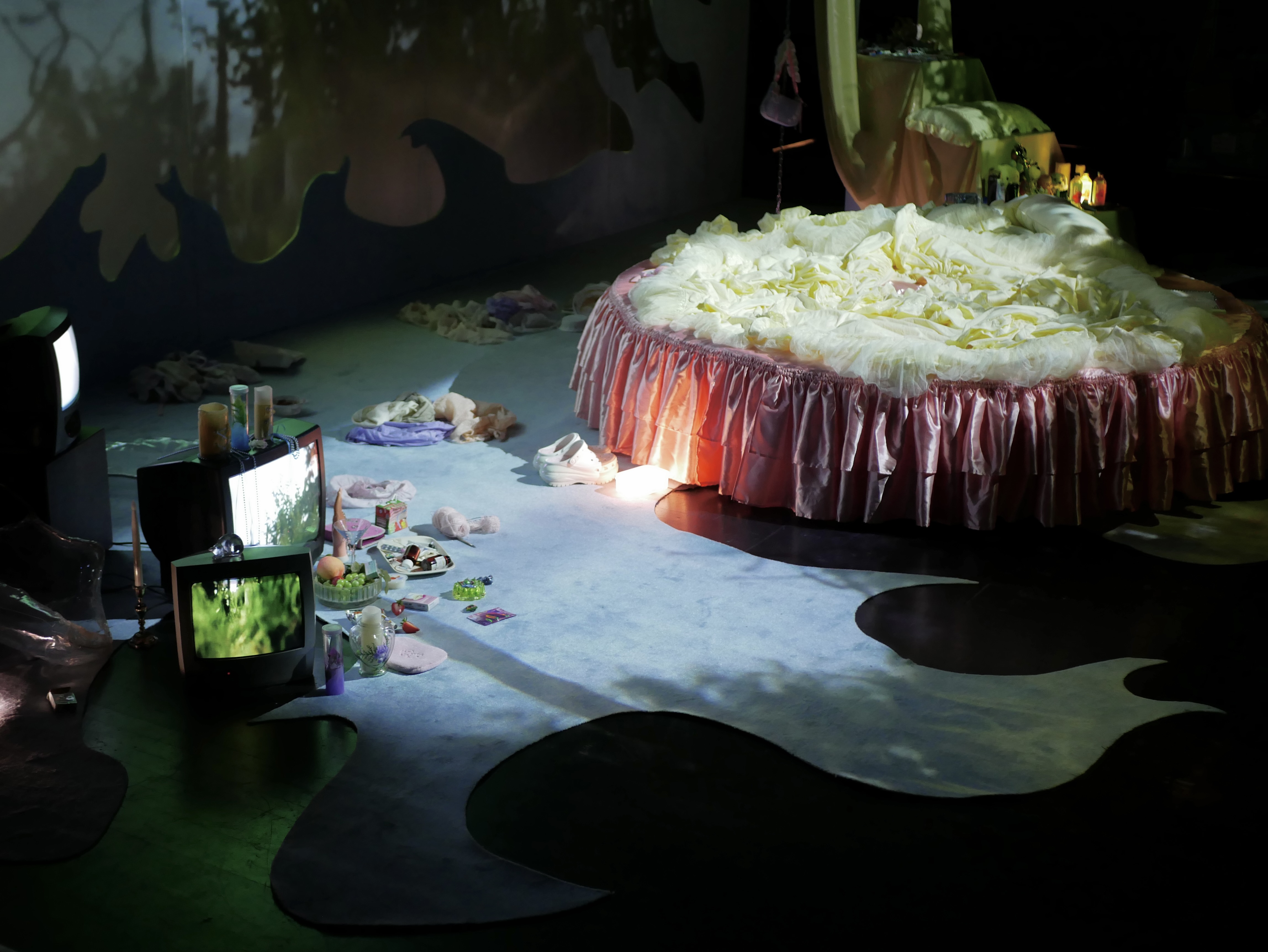 Latex, satin, stainless steel, TV screens, video-projection, found objects